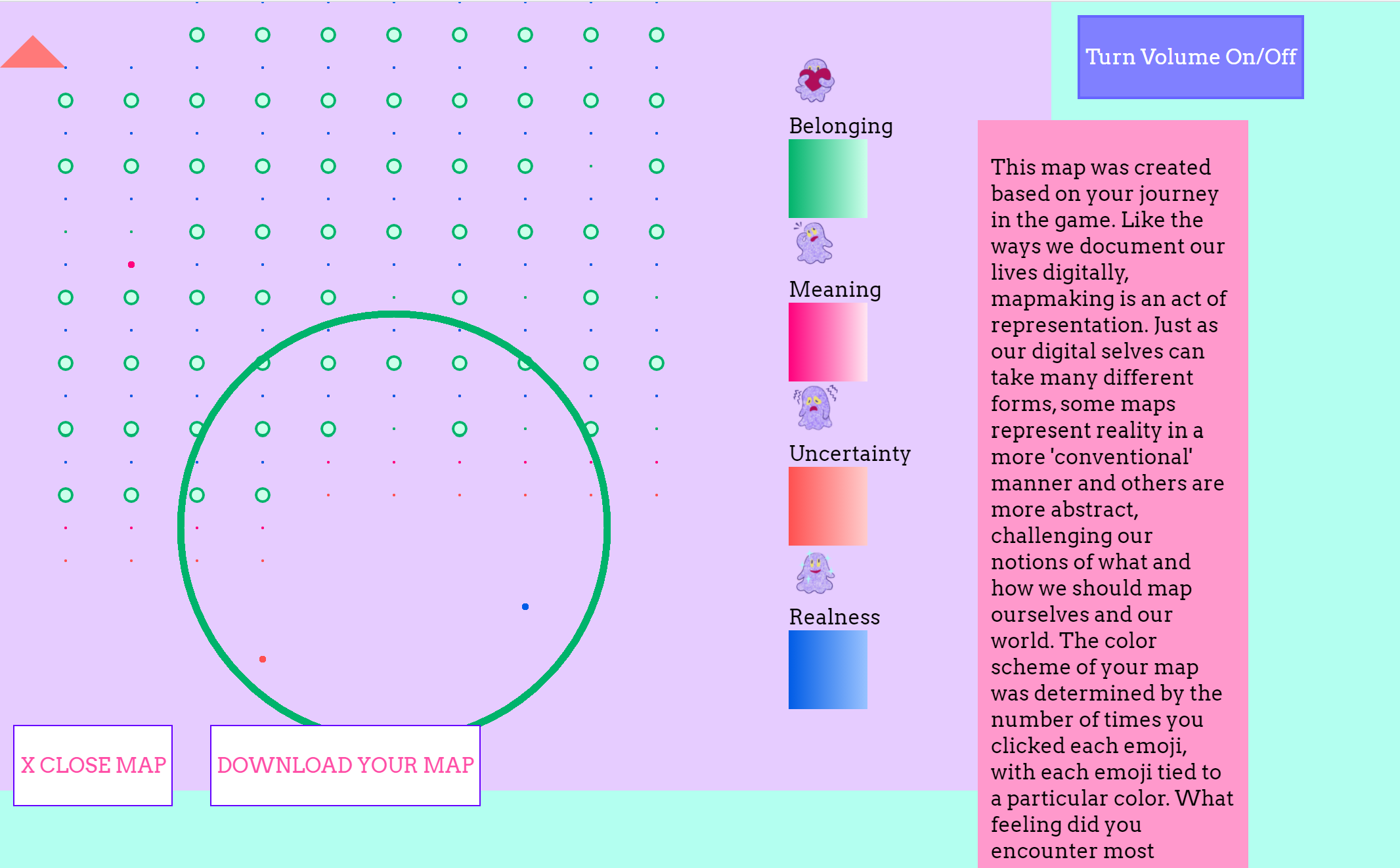 ning, belonging and uncertainty. The manner in which the player chooses these emojis will affect a map of their journey through the game that they receive at the end. The player can replay the game and click on different emojis to reveal a different map.